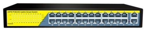 24 портовый PoE коммутатор: 24*10/100Мб/с PoE, 2*10/100/1000Мб/с Uplink, IEEE 802.3i 10BASE-T, IEEE 802.3u 100BASE-TX, IEEE 802.3x Flow Control, IEEE 802.3af PoE, на порт max. 30 Вт, AC 100-240В, 50/60Гц, металлический корпус, 310x185x46мм (в комплекте уголки в стойку U1), 2.5 кг