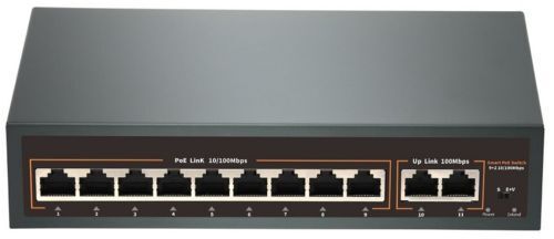 9 портовый PoE коммутатор: 9*10/100Мб/с PoE, 2*10/100Мб/с UPlink, IEEE 802.3, IEEE802.3u, 802.3x, 802.3af/at, на порт max. 30Вт, общая до 140Вт, AC 100-240В, 50/60Гц, металлический корпус, 200x118x44 мм, 1кг